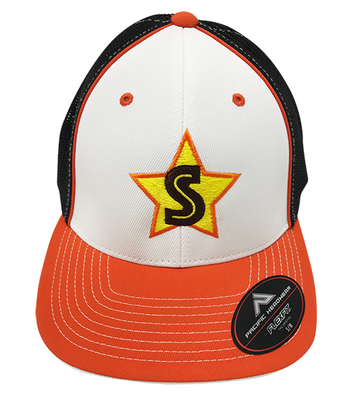 Our custom, embroidered Sports Hat is stretch fit with built in elasticity to allow stretching, but a snug fit. All The Way Live Designs offers custom embroidered hats with your teams logo, number, name and anything else you request. You can also order your hats in a trucker style, but neither style is adjustable. Our hats are provided by pacific Headwear and Richardson and 100% made in the USA.